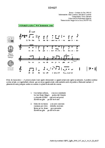 Convén anotar que este canto de reis tocábase “ao tono da gaita”, é dicir: acompañado dela. O estribillo –que se lle chamaba “retrouso” ou “reprendimento”- era unha parte común na que cantaban todos os presentes.