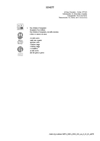| Íncipit textual: | San Adrián é barqueiro | As de alá de arriba |