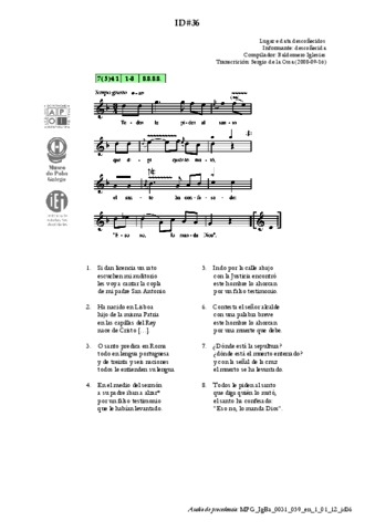 | Áreas de coñecemento: | CRENZAS, VALORES E SABERES VARIOS > Relixiosidade ordinaria. Oracións LITERATURA E DITOS POPULARES > Cantos narrativos |