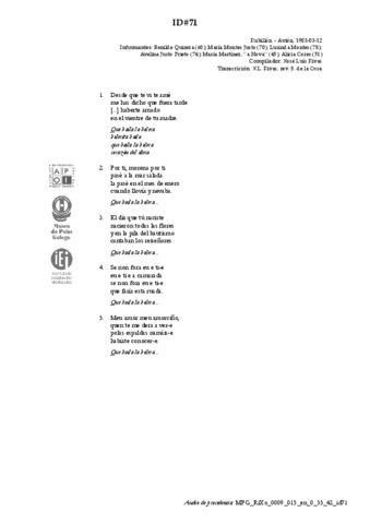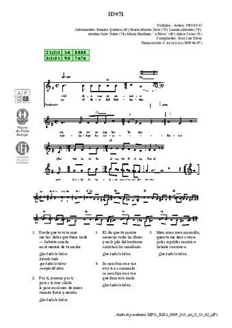 Informantes: - Quireza, Benilde - Montes Justo, María - Montes Justo, Lusinda - Justo Prieto, Avelina - Martínez, María "a Nova" - Cores, Alicia